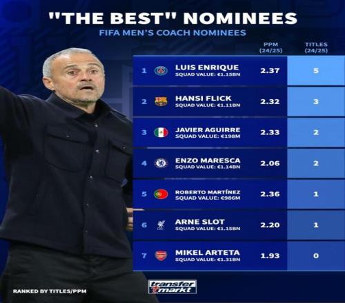 FIFA公布年度最佳男足教练候选名单的,德国转会市场列出了入围者上赛季的成绩。