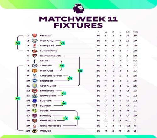 本周末将迎来英超第11轮的较量,赛前英超官方用一张图表清晰展示了本轮交手各队的名次对比之列的。