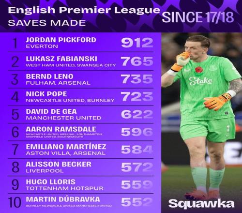 北京时间11月19日,知名数据机构Squawka统计出了英超自2017-18赛季以来门将扑救次数的排行榜,埃弗顿的皮克福德以912次扑救排名第一,法比安斯基765次第二,莱诺735次第三。