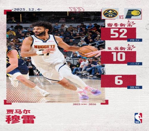 本场比赛,掘金球星贾马尔-穆雷投篮25中19,三分球11中10,罚球5中4,爆砍赛季新高52分另有6篮板4助攻1抢断,10记三分创生涯单场纪录。