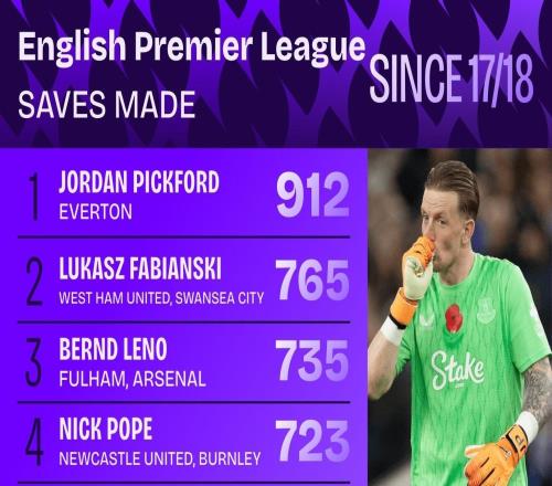 英超自1718赛季以来门将扑救榜:皮克福德第1,德赫亚上榜 -